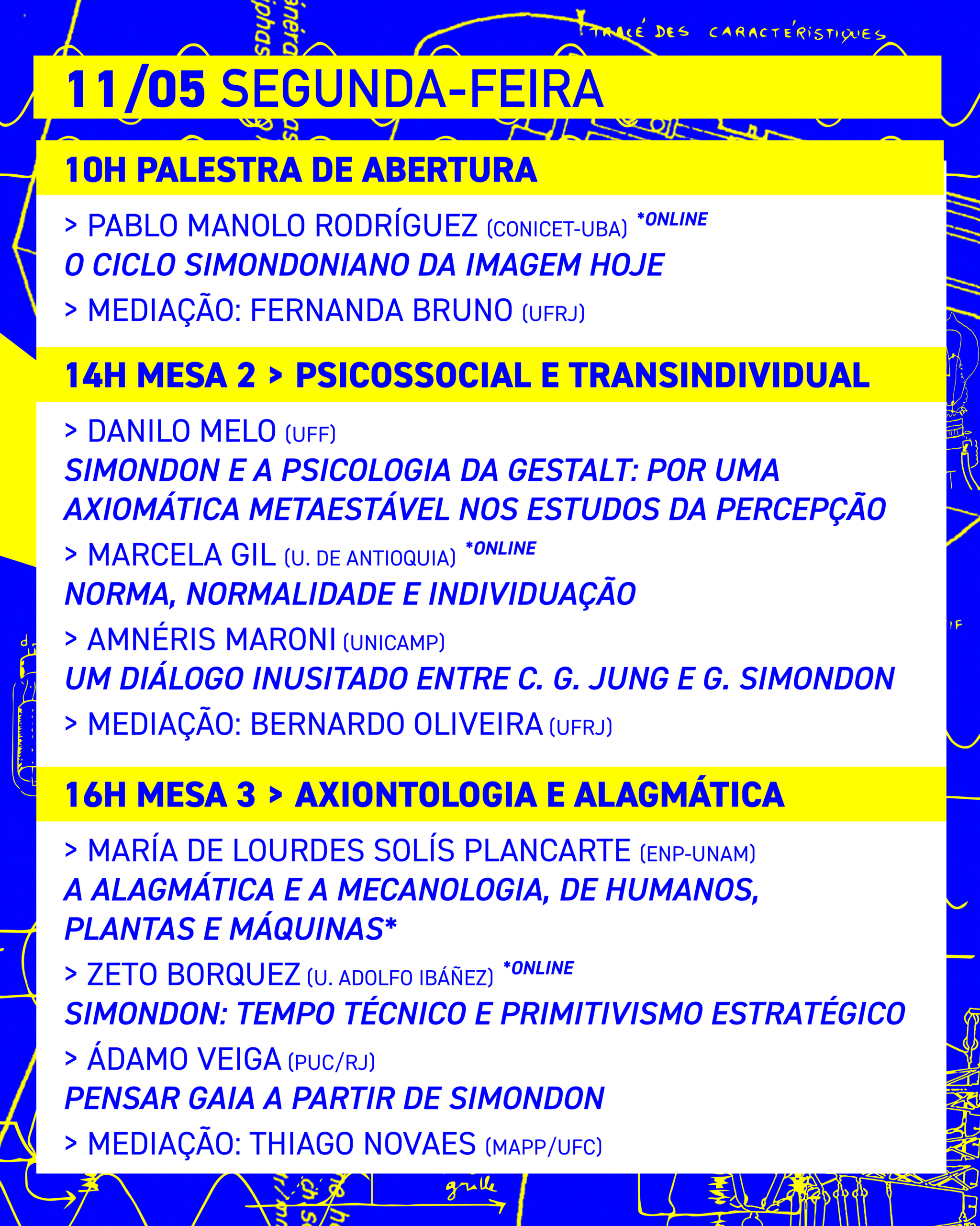 Nesses países, Simondon é convocado por um universo heterogêneo de pesquisadoras e inventoras, em um arco que vai de artistas, ativistas, arqueólogas, cientistas sociais e psicólogas até filósofas. Buscamos propostas de apresentação em todas essas áreas, a fim de estabelecer diálogos capazes de reticular as potências da informação distribuída por tantos povos singulares, em um momento de crises sobrepostas e interrogações urgentes.